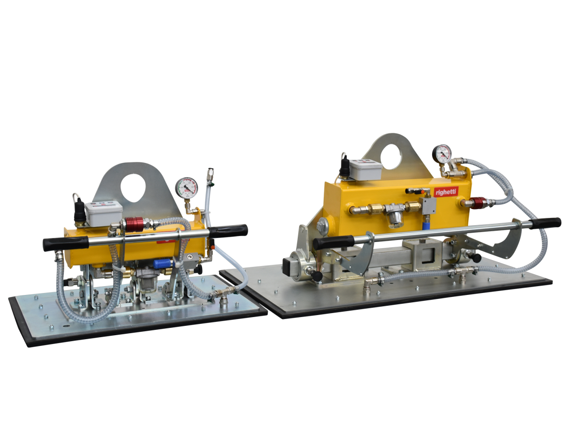 Het M1A heftoestel is een compacte persluchtgestuurde oplossing met één zuiger en een hefvermogen tot 1000 kg. Het toestel is ontworpen voor precisie en stabiliteit bij het verplaatsen van stenen platen in productieomgevingen. Dankzij de handmatige kanteling van 0 tot 90° kan de operator de plaat eenvoudig van verticale naar horizontale positie brengen.