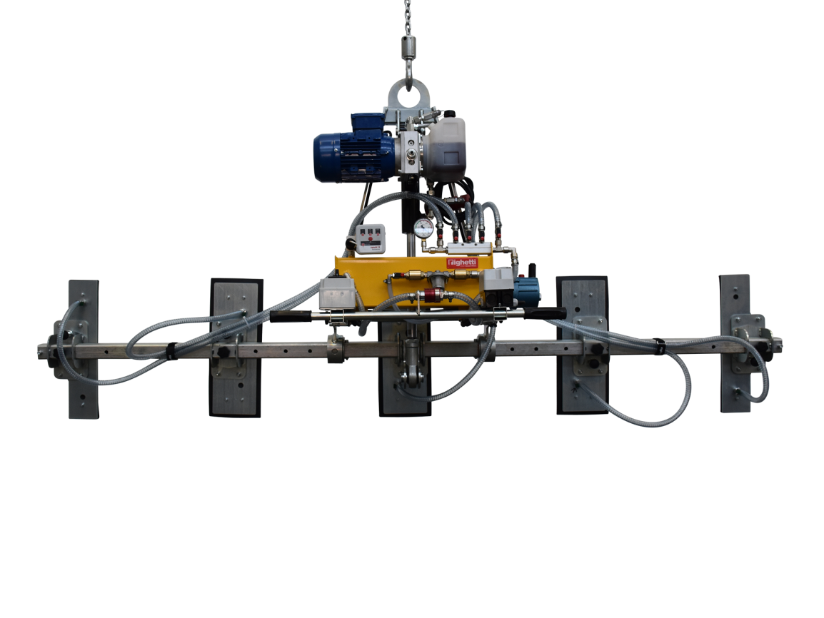 De elektrische vacuümpomp levert constante zuigkracht, terwijl het hydraulische systeem zorgt voor een soepele overgang tussen verticale en horizontale posities. De zuigers zijn individueel verstelbaar, zodat het toestel kan worden aangepast aan uiteenlopende afmetingen. Veiligheidsalarmen en automatische vacuümcontrole garanderen een betrouwbare werking bij elke cyclus.