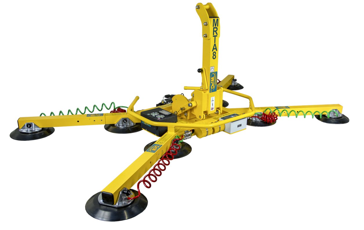 Dankzij de vierstangskoppeling van het Quadra-Tilt systeem kan één operator zware lasten soepel van horizontaal naar verticaal kantelen, zonder extra aandrijving. Het robuuste frame met verwijderbare verlengarmen en verplaatsbare zuignappen maakt de MRTA8 geschikt voor een breed scala aan glasformaten, metalen panelen en andere vlakke of licht gebogen oppervlakken.